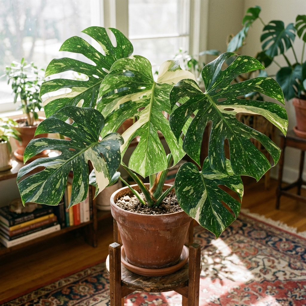 Rare variegated Monstera with beautiful creamy white splashes. A true collector's item that brings a touch of luxury to your indoor jungle.
